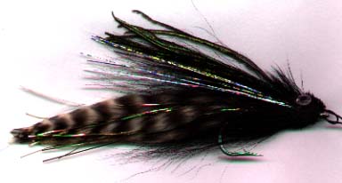 ALA: dos o tres mechones de Streamer Hair a lo largo del anzuelo con fibras de holographic flashabou a los costados, con un largo desde el último mechón del ala hasta donde termina la cola.